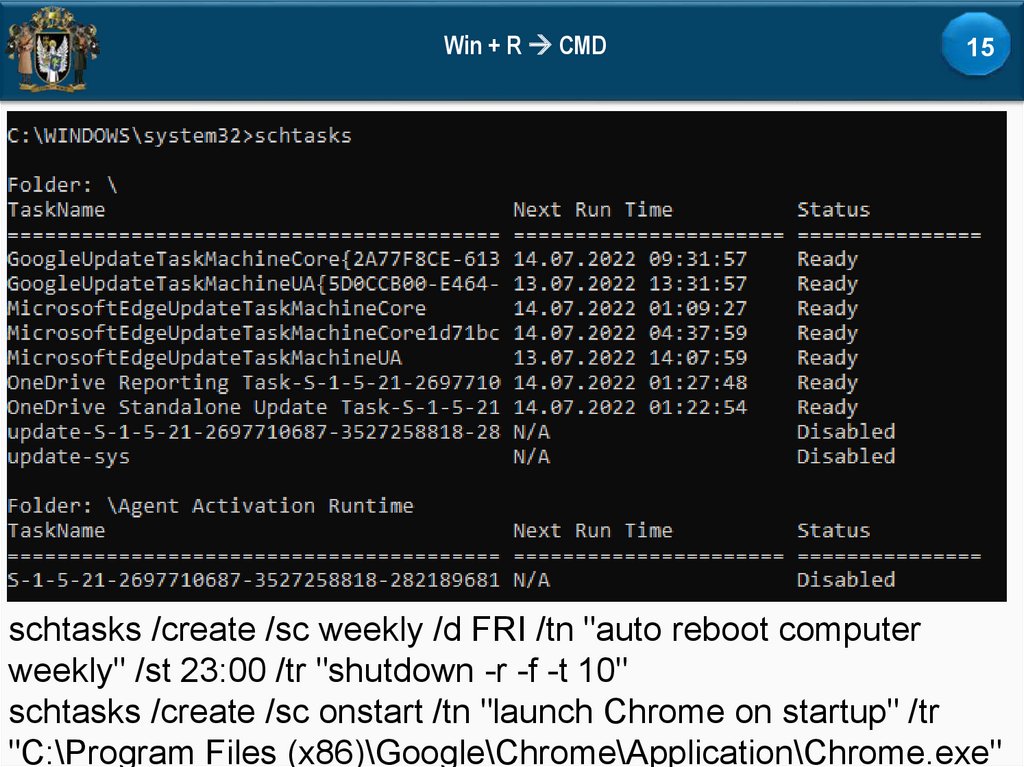 schtasks /create /sc weekly /d FRI /tn "auto reboot computer