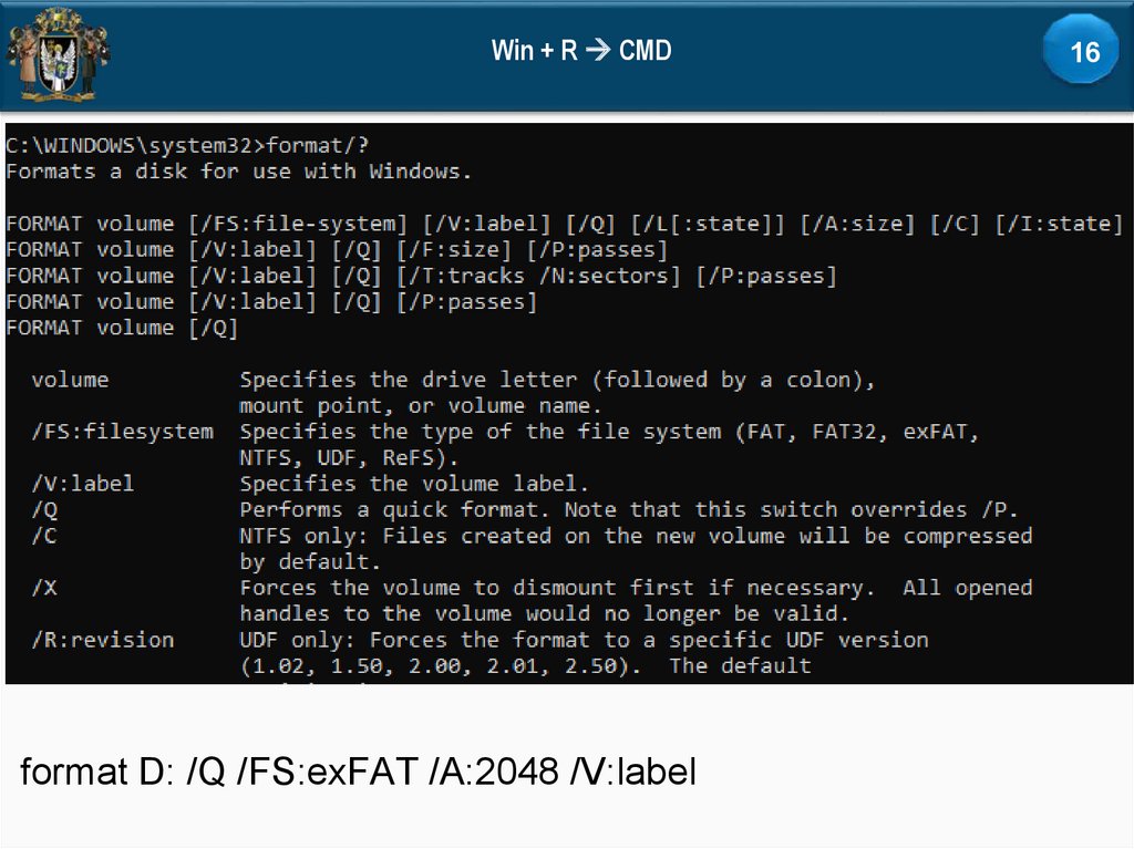 Win + R CMDformat D: /Q /FS:exFAT /A:2048 /V:label