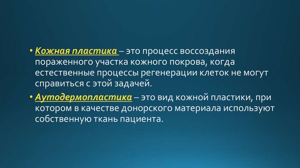 • Кожная пластика – это процесс воссозданияпораженного участка кожного покрова, когда