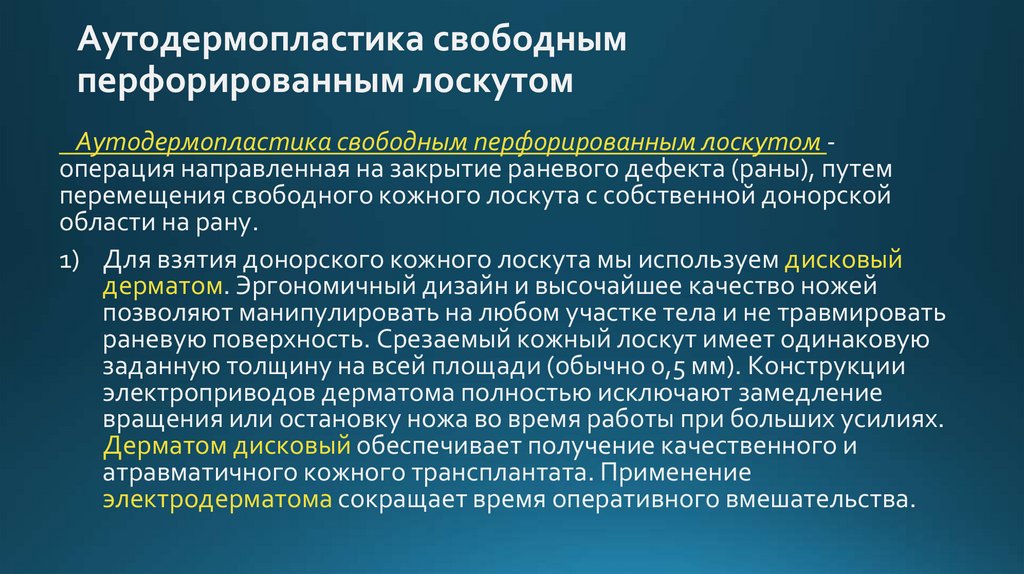 Аутодермопластика свободным перфорированным лоскутом операция направленная на закрытие раневого дефекта (раны), путем