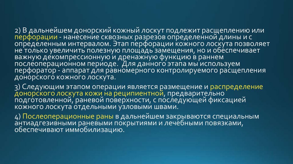 2) В дальнейшем донорский кожный лоскут подлежит расщеплению илиперфорации - нанесение сквозных разрезов определенной длины и с