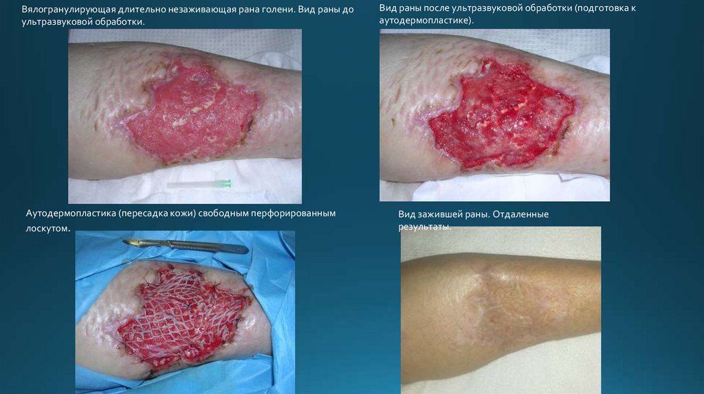 Вялогранулирующая длительно незаживающая рана голени. Вид раны доультразвуковой обработки.