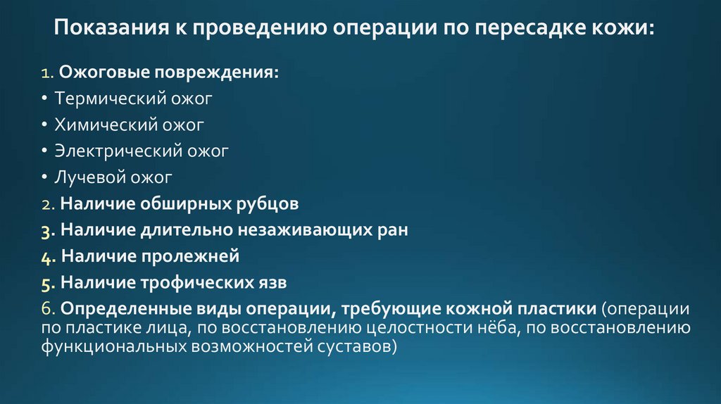Показания к проведению операции по пересадке кожи:1. Ожоговые повреждения: