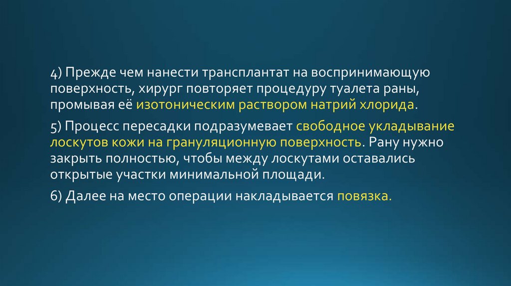 4) Прежде чем нанести трансплантат на воспринимающуюповерхность, хирург повторяет процедуру туалета раны,