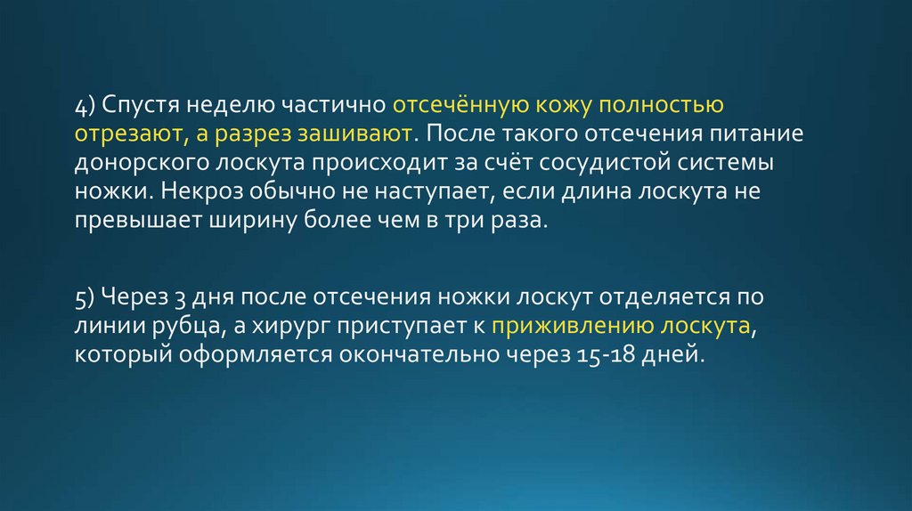 4) Спустя неделю частично отсечённую кожу полностьюотрезают, а разрез зашивают. После такого отсечения питание