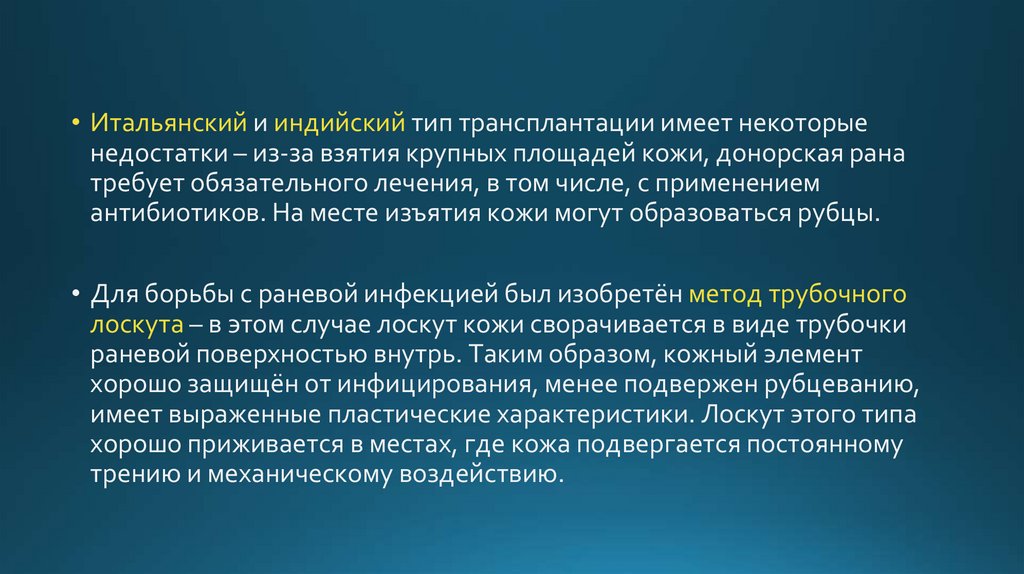 • Итальянский и индийский тип трансплантации имеет некоторыенедостатки – из-за взятия крупных площадей кожи, донорская рана