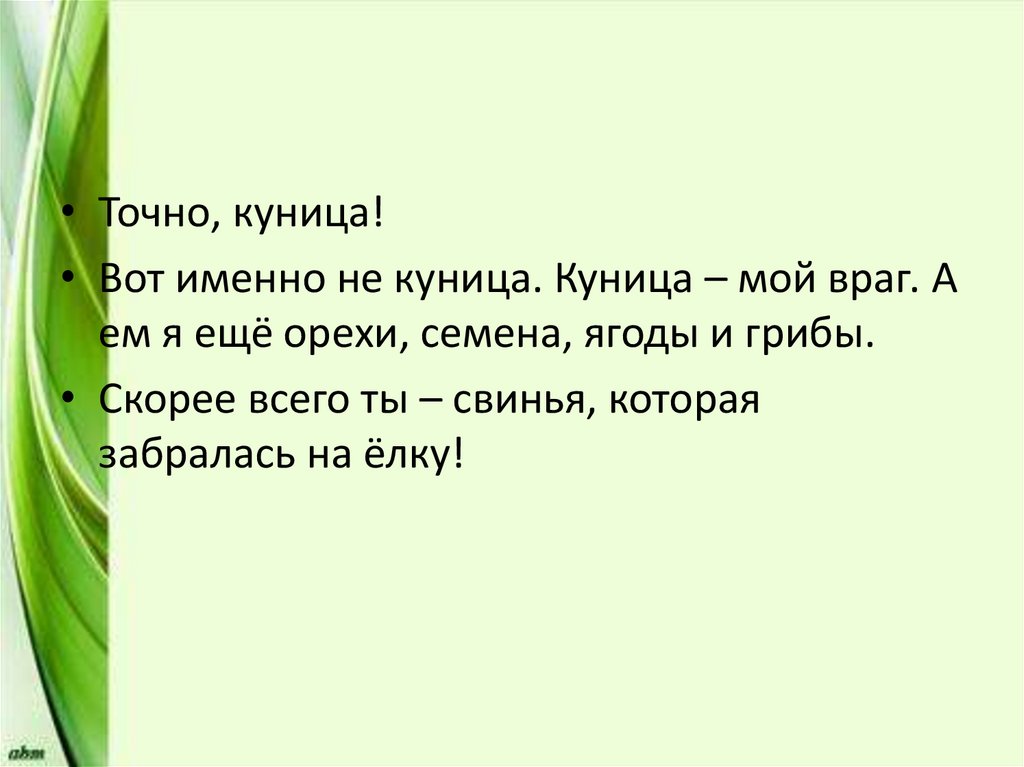 • Точно, куница!• Вот именно не куница. Куница – мой враг. А