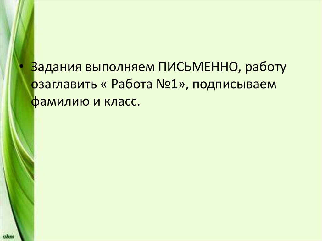 • Задания выполняем ПИСЬМЕННО, работуозаглавить « Работа №1», подписываем
