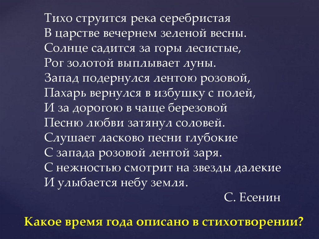 Тихо струится река серебристаяВ царстве вечернем зеленой весны.