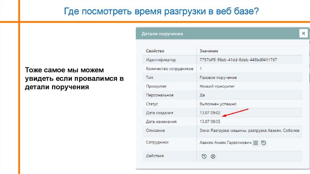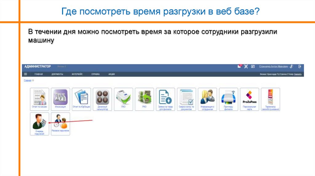 Где посмотреть время разгрузки в веб базе?В течении дня можно посмотреть время за которое сотрудники разгрузили