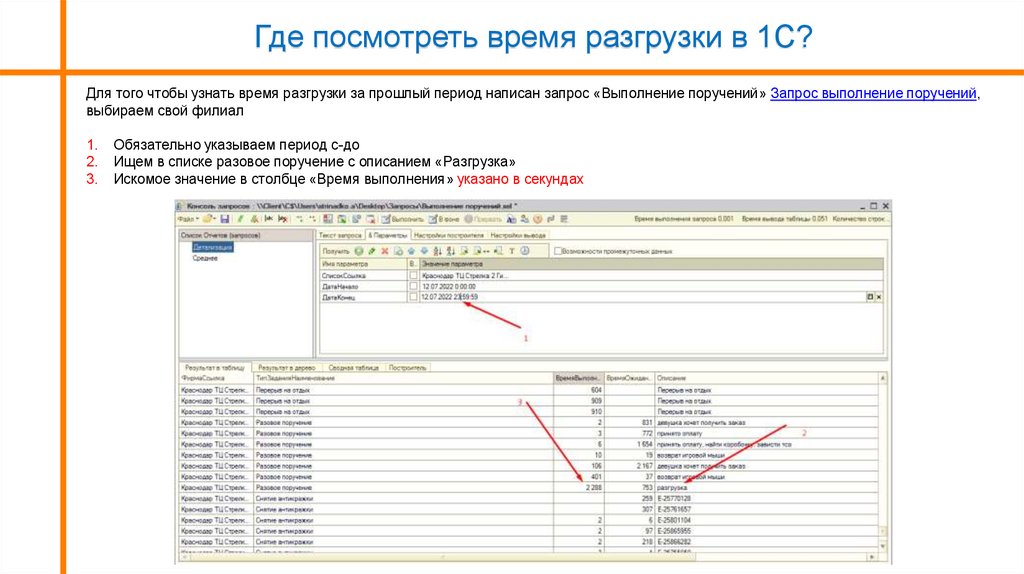 Где посмотреть время разгрузки в 1С?Для того чтобы узнать время разгрузки за прошлый период написан запрос «Выполнение поручений» Запрос выполнение поручений,