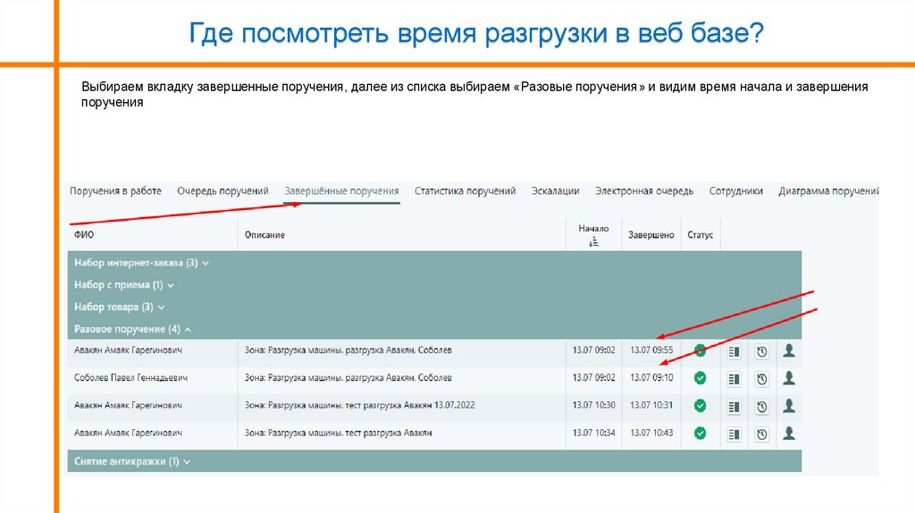 Где посмотреть время разгрузки в веб базе?Выбираем вкладку завершенные поручения, далее из списка выбираем «Разовые поручения» и видим время начала и завершения