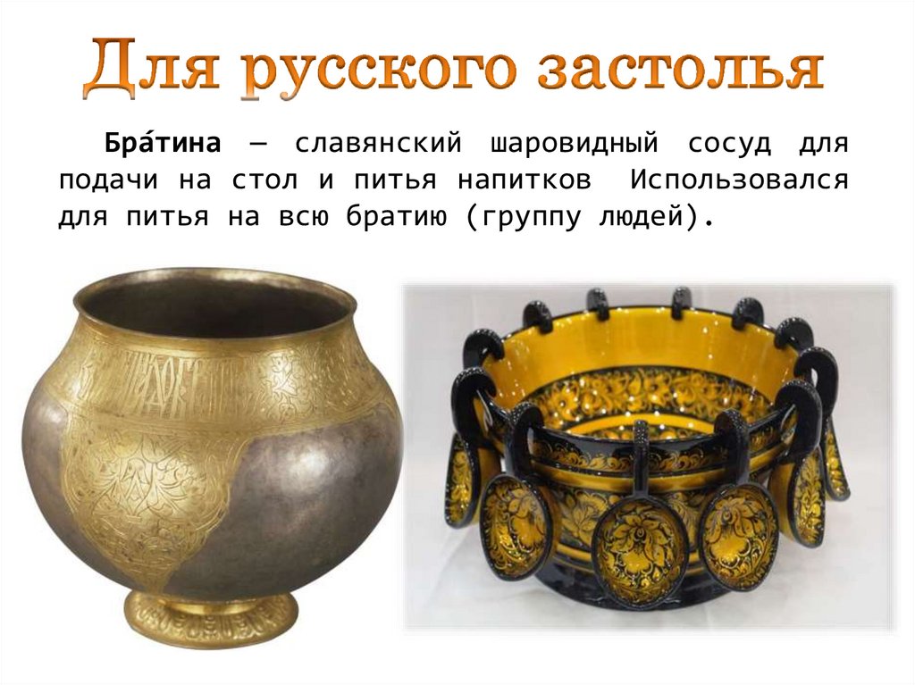 Бра́тина — славянский шаровидный сосуд дляподачи на стол и питья напитков Использовался