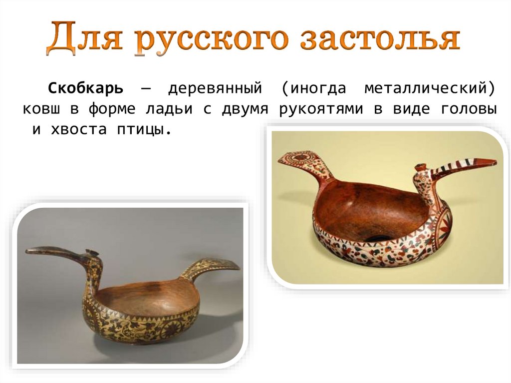 Скобкарь — деревянный (иногда металлический)ковш в форме ладьи с двумя рукоятями в виде головы