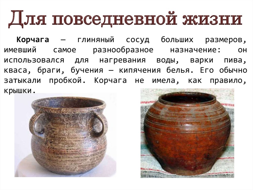 Для повседневной жизниКорчага — глиняный сосуд больших размеров,