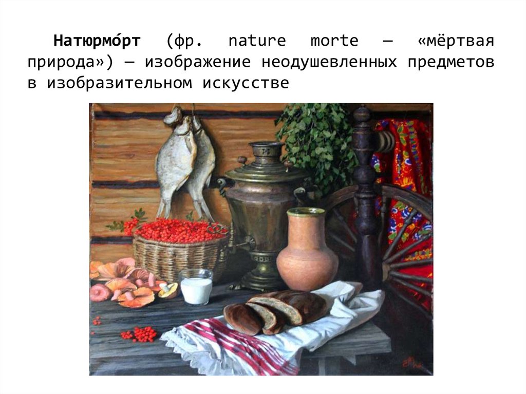 Натюрмо́рт (фр. nature morte — «мёртваяприрода») — изображение неодушевленных предметов