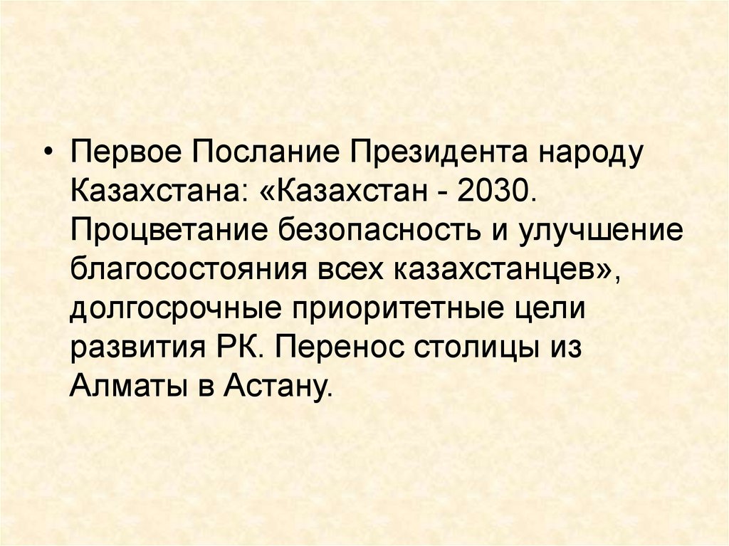 • Первое Послание Президента народуКазахстана: «Казахстан - 2030.