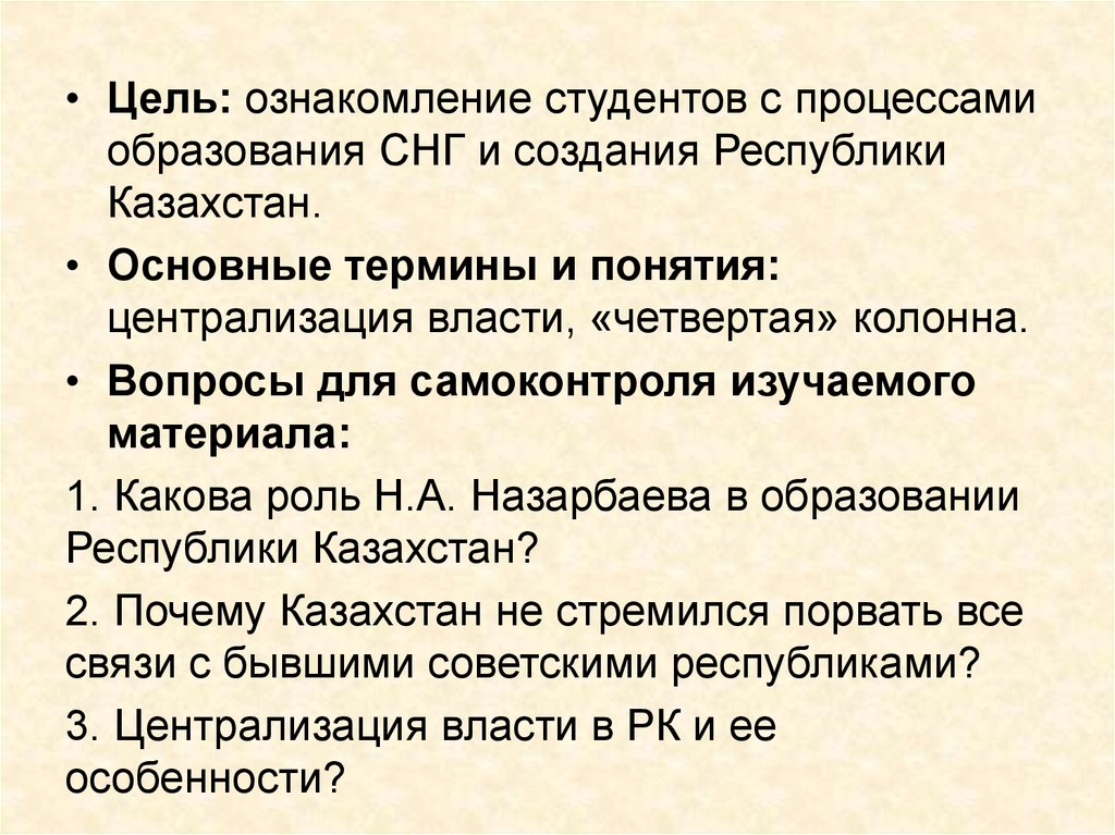 • Цель: ознакомление студентов с процессамиобразования СНГ и создания Республики