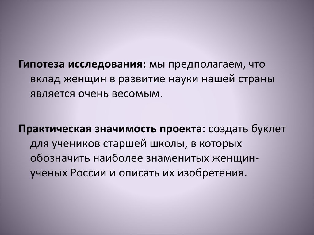 Гипотеза исследования: мы предполагаем, чтовклад женщин в развитие науки нашей страны