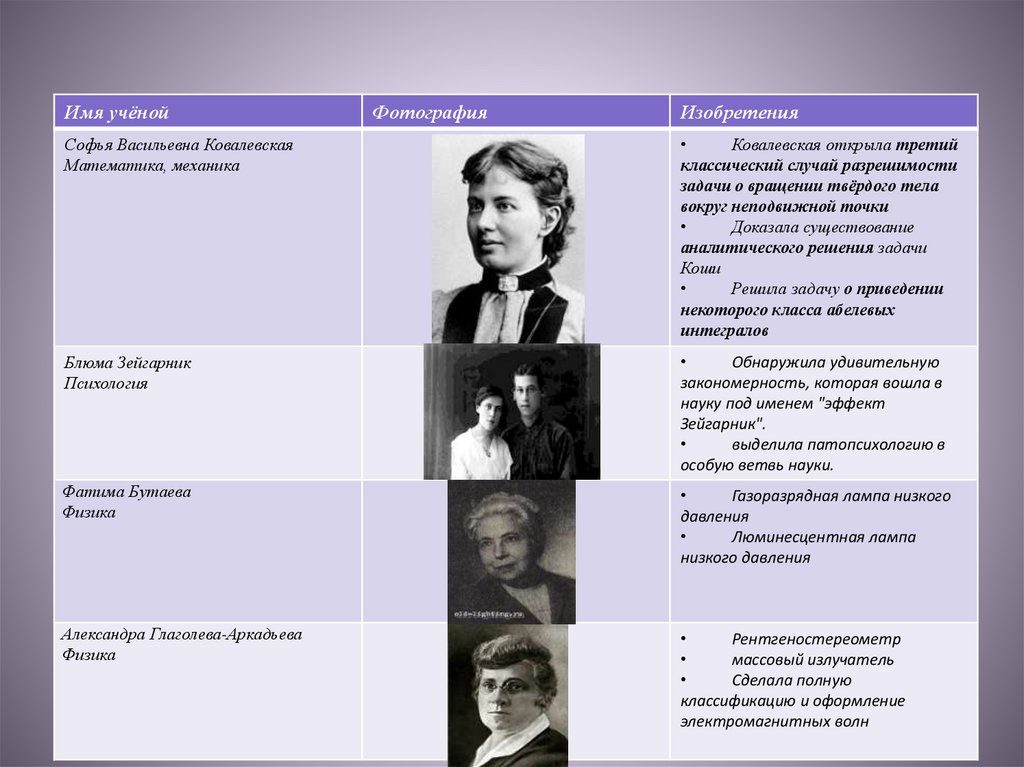 обозначить наиболее знаменитых женщинученых России и описать их изобретения.