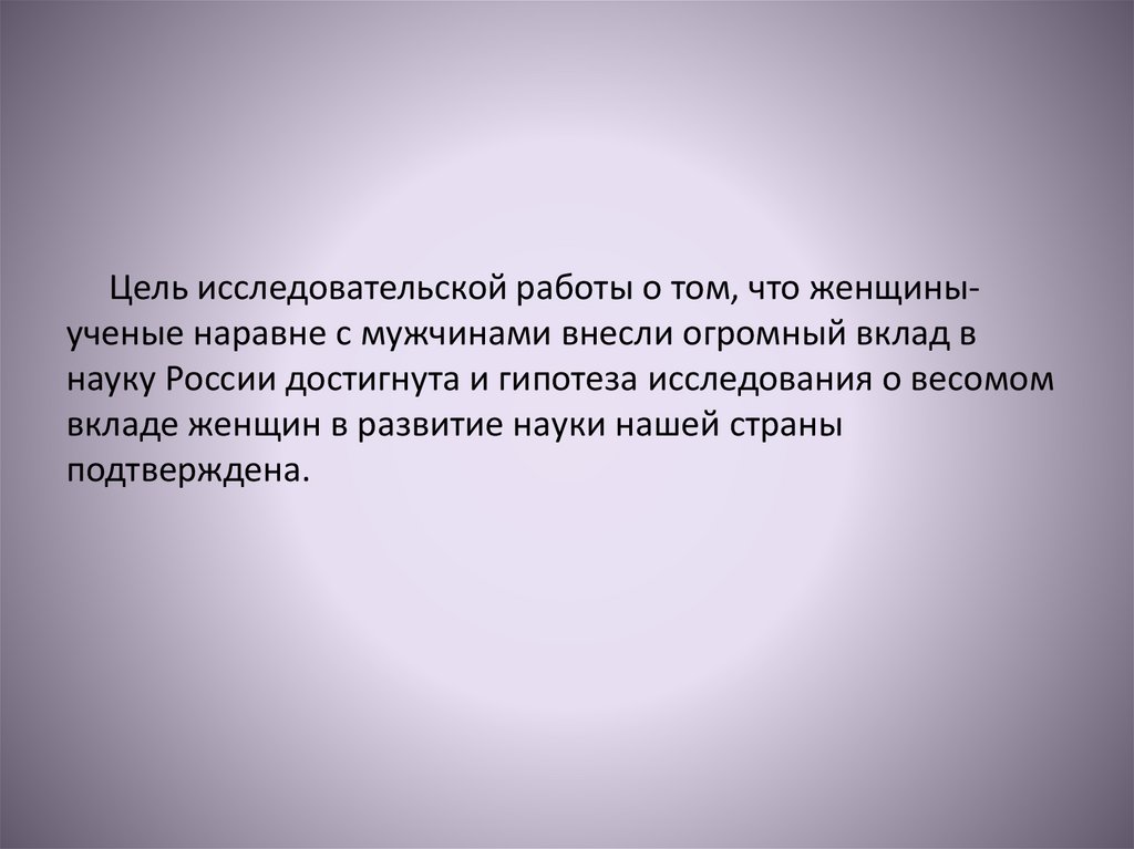 Цель исследовательской работы о том, что женщиныученые наравне с мужчинами внесли огромный вклад внауку России достигнута и гипотеза исследования о весомом