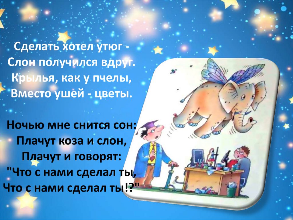 Сделать хотел утюг Слон получился вдруг.Крылья, как у пчелы,