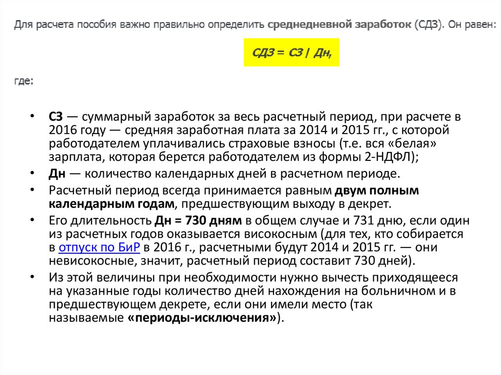 • СЗ — суммарный заработок за весь расчетный период, при расчете в2016 году — средняя заработная плата за 2014 и 2015 гг., с которой