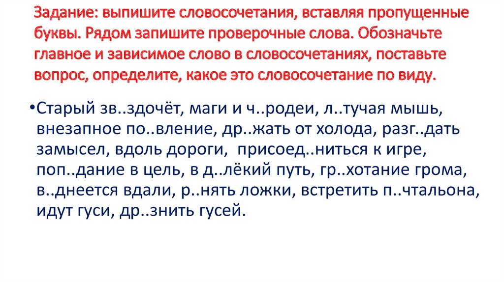 Задание: выпишите словосочетания, вставляя пропущенныебуквы. Рядом запишите проверочные слова. Обозначьте