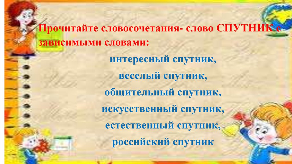 Прочитайте словосочетания- слово СПУТНИК сзависимыми словами:
