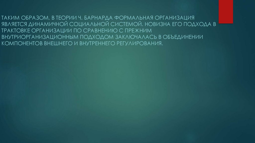 ТАКИМ ОБРАЗОМ, В ТЕОРИИ Ч. БАРНАРДА ФОРМАЛЬНАЯ ОРГАНИЗАЦИЯЯВЛЯЕТСЯ ДИНАМИЧНОЙ СОЦИАЛЬНОЙ СИСТЕМОЙ. НОВИЗНА ЕГО ПОДХОДА В