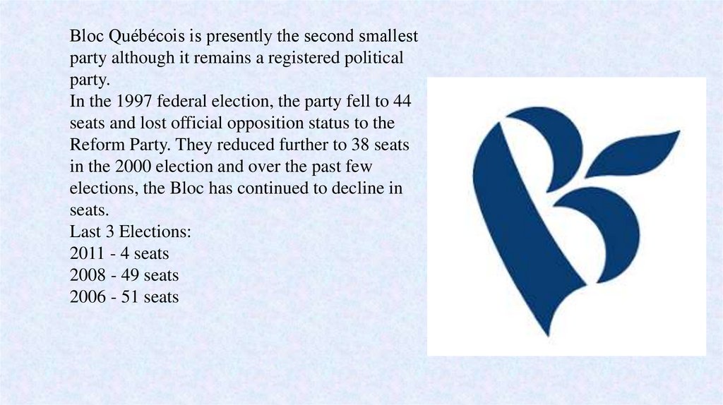 Bloc Québécois is presently the second smallestparty although it remains a registered political