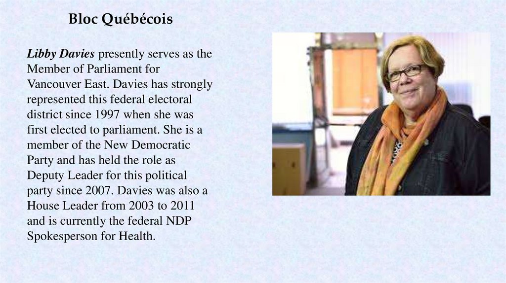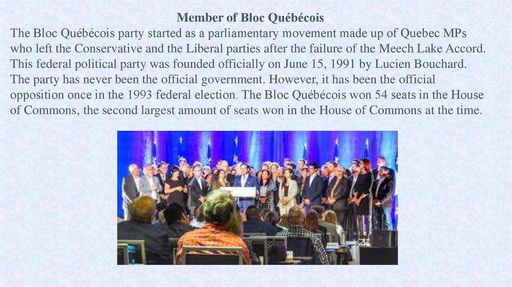Member of Bloc QuébécoisThe Bloc Québécois party started as a parliamentary movement made up of Quebec MPs