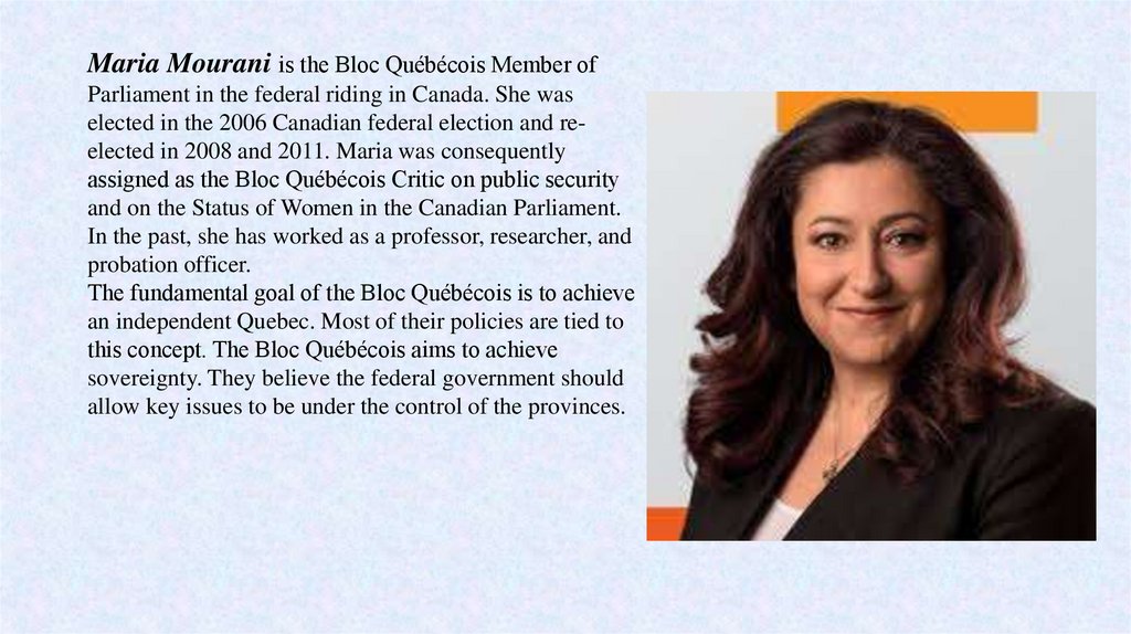 Maria Mourani is the Bloc Québécois Member ofParliament in the federal riding in Canada. She was