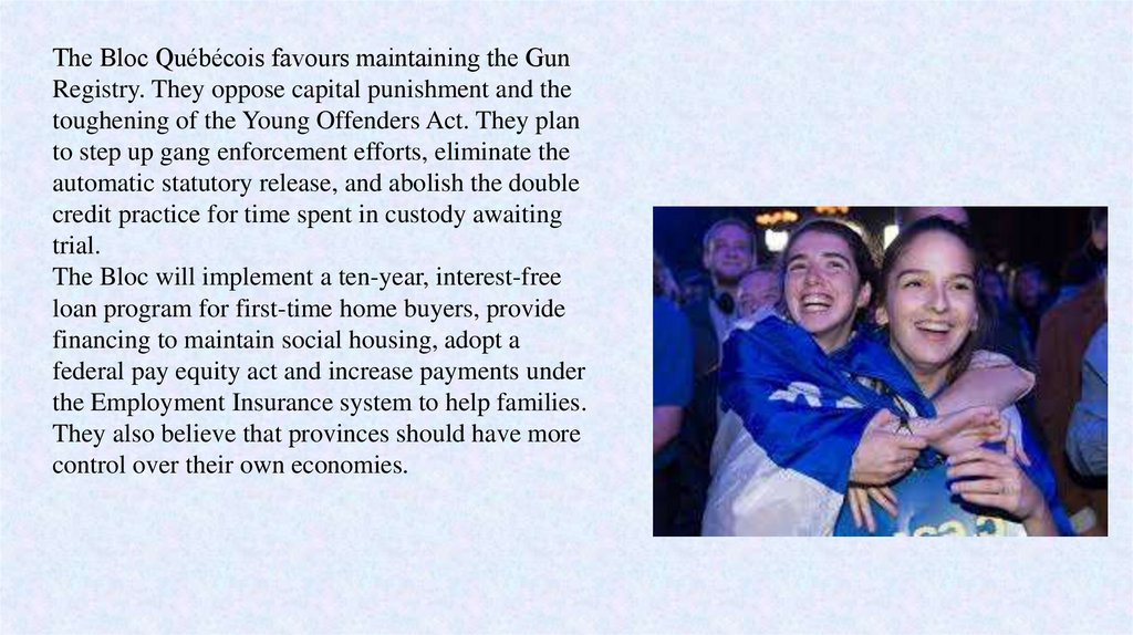 The Bloc Québécois favours maintaining the GunRegistry. They oppose capital punishment and the