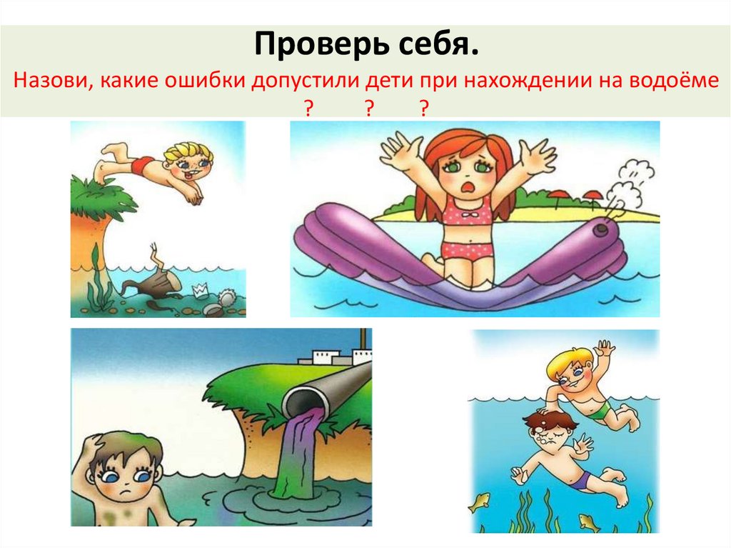 Проверь себя.Назови, какие ошибки допустили дети при нахождении на водоёме