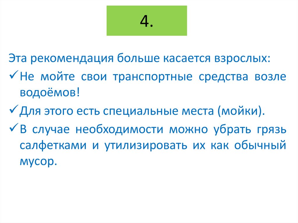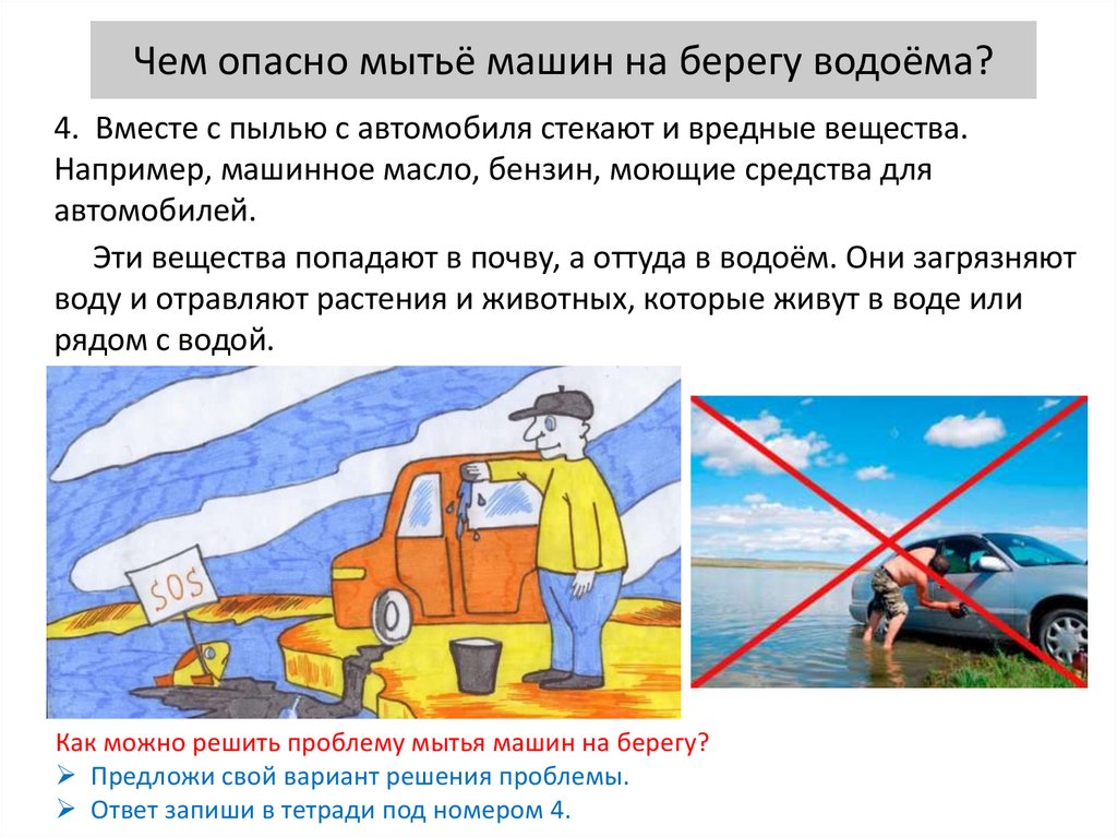 Чем опасно мытьё машин на берегу водоёма?4. Вместе с пылью с автомобиля стекают и вредные вещества.