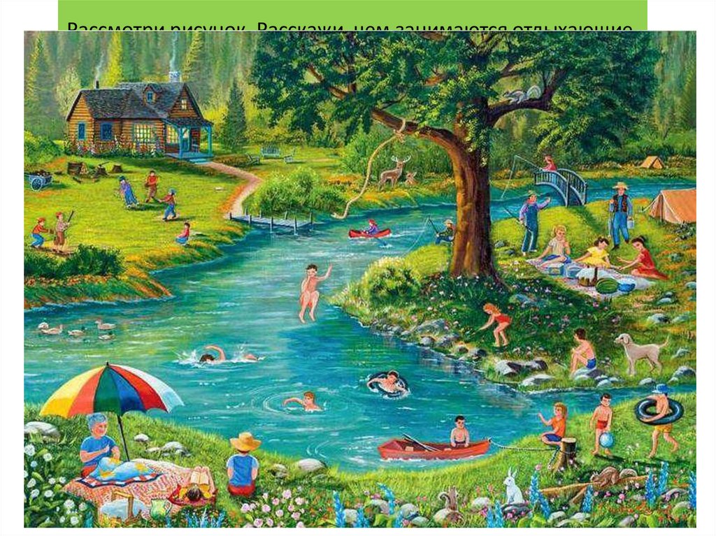 Рассмотри рисунок. Расскажи, чем занимаются отдыхающие.5.