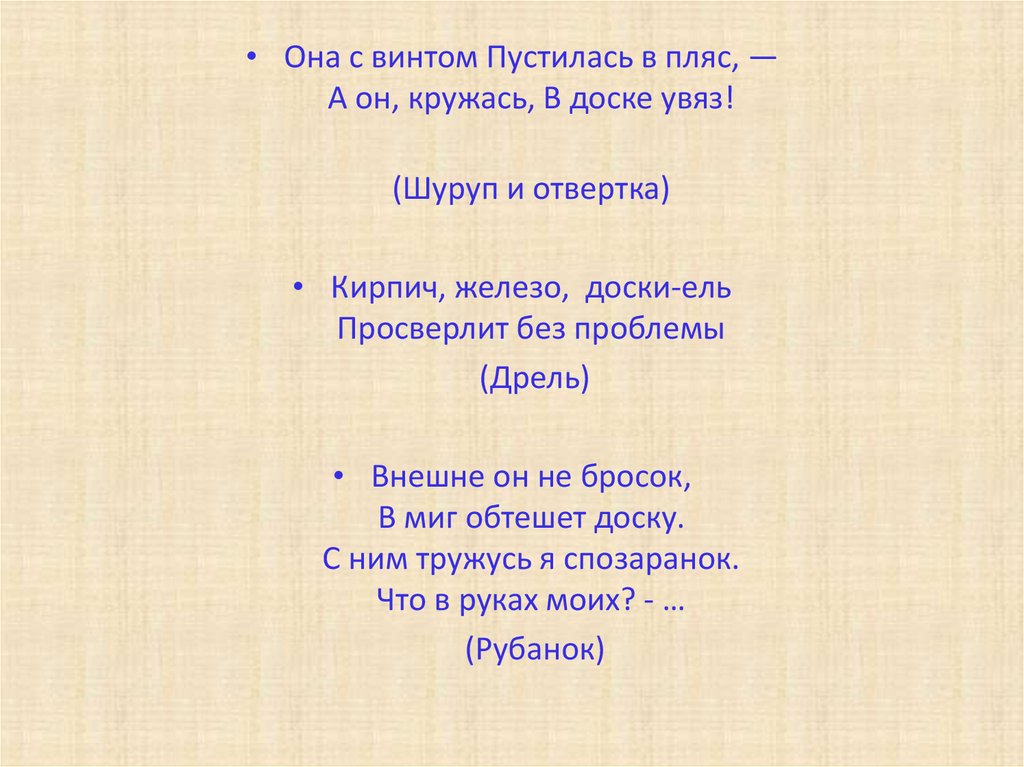 • Она с винтом Пустилась в пляс, —А он, кружась, В доске увяз!