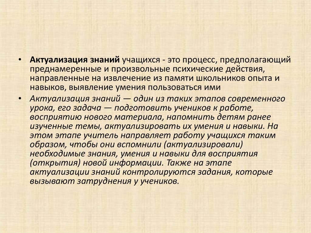• Актуализация знаний учащихся - это процесс, предполагающийпреднамеренные и произвольные психические действия,