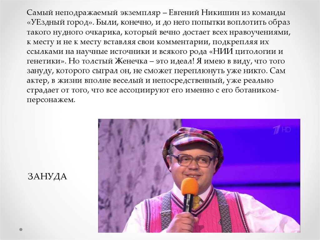 Самый неподражаемый экземпляр – Евгений Никишин из команды«УЕздный город». Были, конечно, и до него попытки воплотить образ