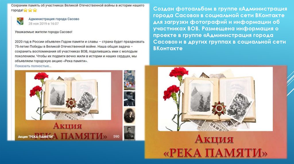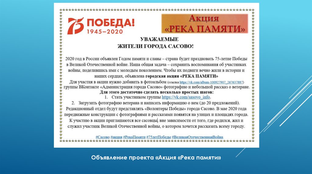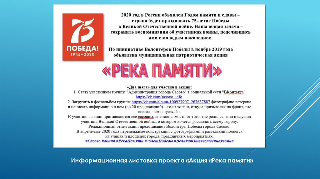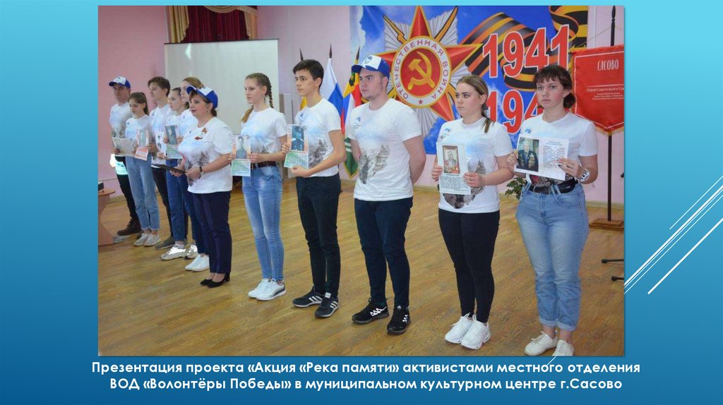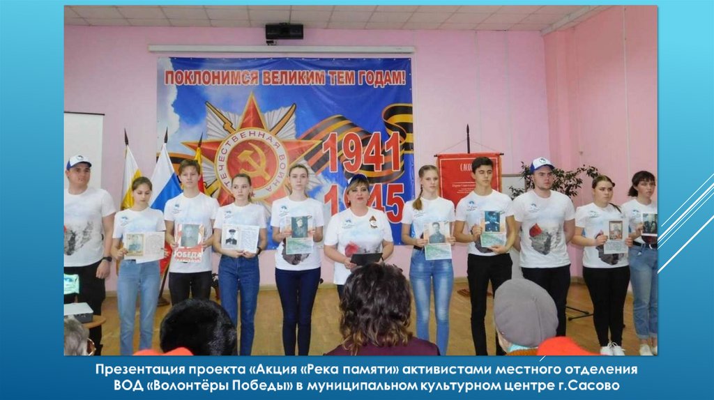 Презентация проекта «Акция «Река памяти» активистами местного отделенияВОД «Волонтёры Победы» в муниципальном культурном центре г.Сасово