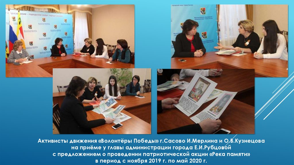 Активисты движения «Волонтёры Победы» г.Сасово И.Мерлина и О.В.Кузнецована приёме у главы администрации города Е.И.Рубцовой