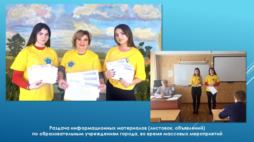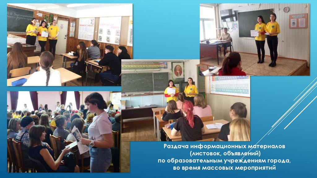 Раздача информационных материалов (листовок, объявлений)по образовательным учреждениям города, во время массовых мероприятий