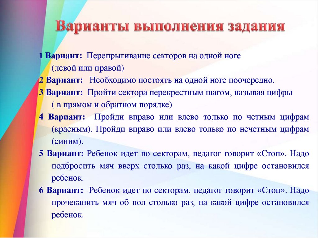 6 Вариант: Ребенок идет по секторам, педагог говорит «Стоп». Надо