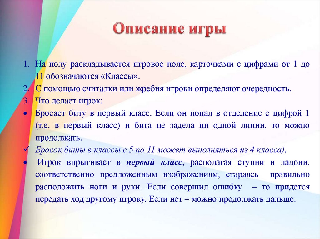 1. На полу раскладывается игровое поле, карточками с цифрами от 1 до11 обозначаются «Классы».