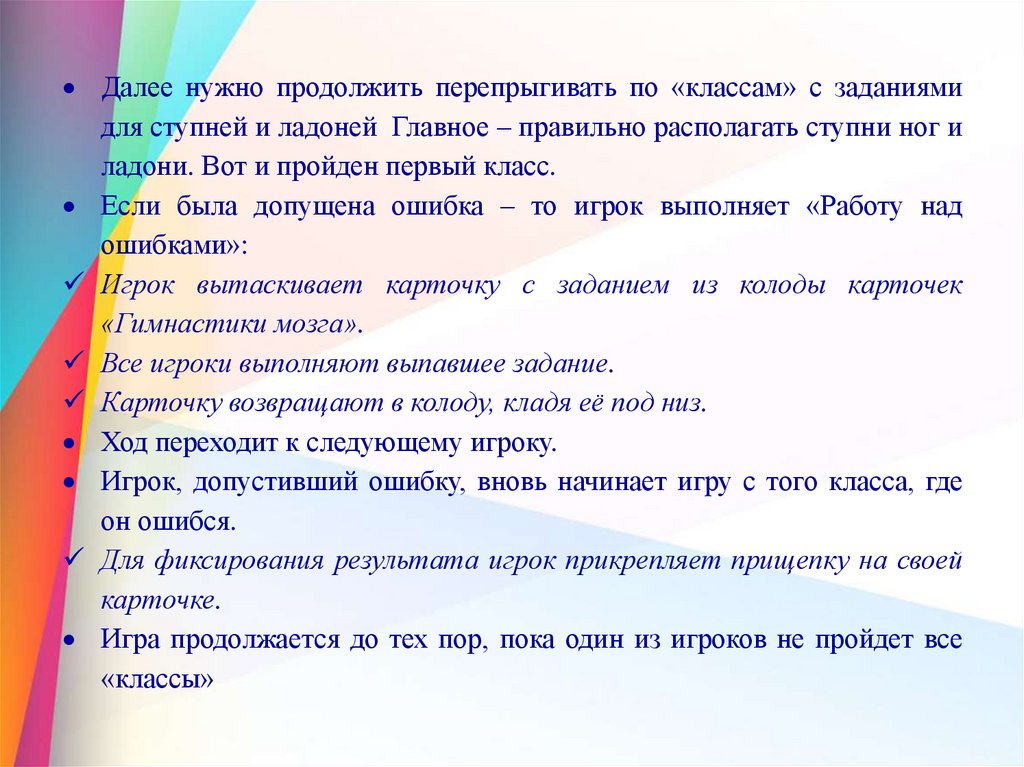 Далее нужно продолжить перепрыгивать по «классам» с заданиямидля ступней и ладоней Главное – правильно располагать ступни ног и