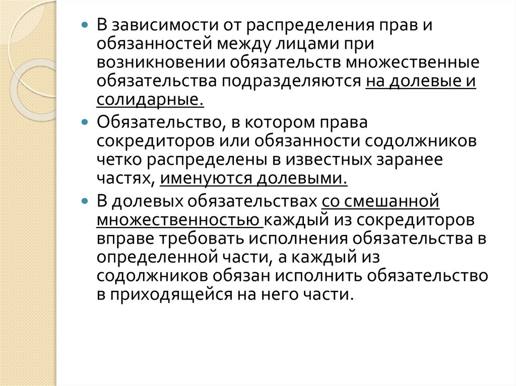 обязательства подразделяются на долевые и