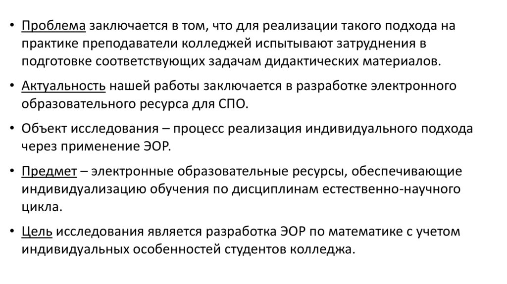 • Проблема заключается в том, что для реализации такого подхода напрактике преподаватели колледжей испытывают затруднения в