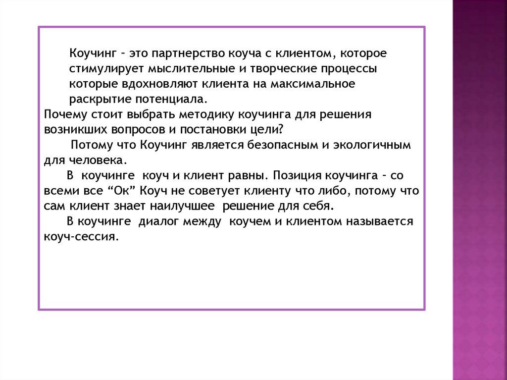 Коучинг – это партнерство коуча с клиентом, котороестимулирует мыслительные и творческие процессы
