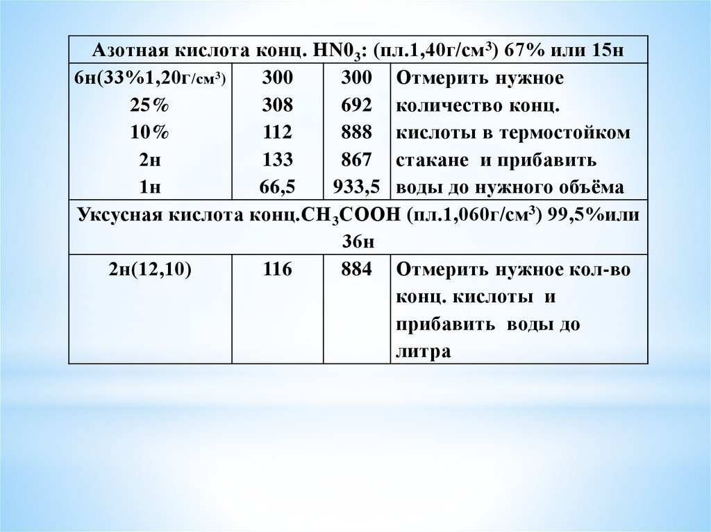 Азотная кислота конц. HN0 3: (пл.1,40г/см 3) 67% или 15н6н(33%1,20г /см3)